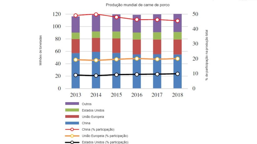 Segundo a "Revisão do mercado de carnes da FAO: Resumo da evolução do mercado mundial de carnes em 2018", a produção mundial de carne de porco em 2018 é estimada em 120,5 milhões de toneladas, registando crescimento marginal de 0,6% em relação a 2017.