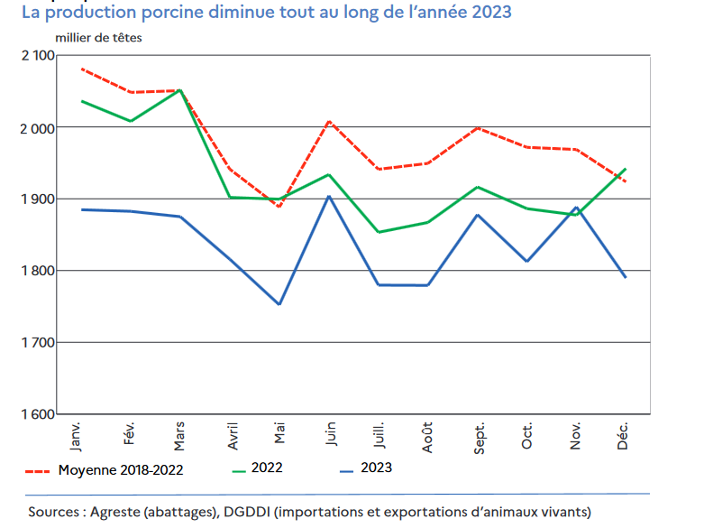 Em 2023, a produção suína francesa registou uma queda acentuada de 5% face ao ano anterior, atingindo cerca de 22 milhões de cabeças, uma diminuição de 1,5 milhões face a 2022. Esta redução é atribuível à contínua contracção do efectivo suíno francês, uma tendência verificada há mais de vinte anos. Ao mesmo tempo, o peso médio da carcaça aumentou continuamente durante duas décadas, ajudando a compensar parcialmente a queda do número de cabeças abatidas. A região do Grand Ouest, que concentra 79% dos abates nacionais, registou uma diminuição significativa dos abates, com uma diminuição notável na Bretanha e no Pays do Loire.