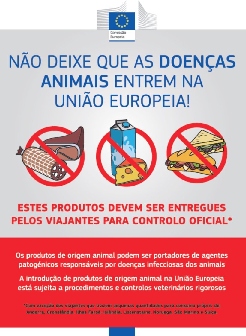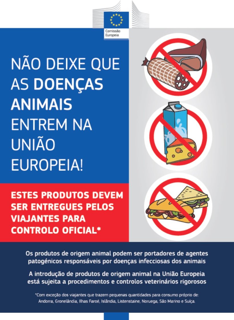 A Comissão Europeia publicou, no Diário Oficial da União Europeia, os dois novos tipos de cartazes destinados a chamar a atenção dos viajantes procedentes de países terceiros sobre as condições veterinárias aplicáveis a itens pessoais introduzidos na União, em concreto aos produtos de origem animal que constituem a bagagem.