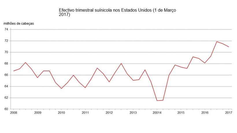 A 1 de Março havia 71,0 milhões de cabeças de suíno nos Estados Unidos, mais 4% que em Março de 2016, mas menos 1% em comparação com os dados do trimestre anterior (1 de Dezembro de 2016), segundo o relatório trimestral publicado pelo Serviço de Estatísticas Agrícolas (NASS) do USDA. Do total, 6,07 milhões de cabeças são reprodutores.