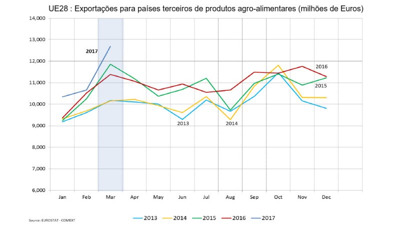 As exportações agro-alimentares da UE atingiram um valor record de quase 12700 milhões de euros em Março de 2017, de acordo com o último relatório sobre o comércio agro-alimentar publicado pela Comissão Europeia a 18 de Maio de 2017. Este montante é 1,31 milhões de euros mais elevado que o de Março de 2016 (+1,3%) e é o valor mensal de exportação mais elevado observado nos últimos 5 anos..
