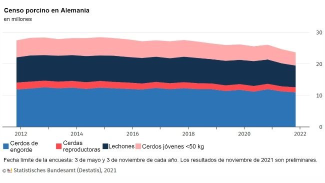 Según los resultados finales de la Oficina Federal de Estadística (Destatis), a 3 de noviembre de 2021, la cabaña porcina de Alemania fue de 23,8 millones de cerdos, un 8,9% o 2.307.600 animales menos en comparación con el 3 de noviembre de 2020. Aunque la caída es algo menor en comparación con los resultados preliminares informados en diciembre (-9,4%), la reducción del censo porcino en Alemania sigue siendo elevada respecto al año anterior.
