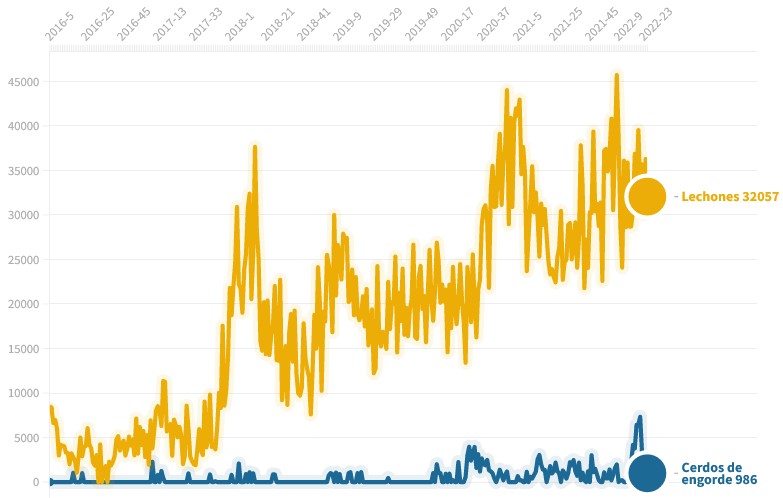 En el siguiente gráfico te mostramos la evolución semanal en las importaciones de cerdos y lechones neerlandeses desde 2016.