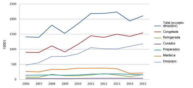 Si bien se observan aumentos para todos los productos porcinos, a excepción de las exportaciones de manteca de cerdo, destaca el importante aumento de las exportaciones de despojos, que son el segundo producto porcino más exportado después de la carne de cerdo congelada y que han pasado de las 473.000 t en 2006 a 1.118.000 t en 2015.