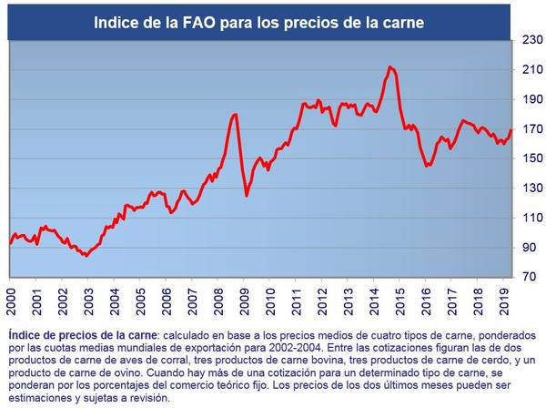 El índice de precios de la carne de la FAO registró un promedio de poco más de 169 puntos en abril, esto es, 4,9 puntos (un 3,0 %) más que en marzo, en particular por los incrementos intermensuales de las cotizaciones de las carnes de cerdo y bovino y, de forma más moderada, las carnes de aves de corral y ovino.