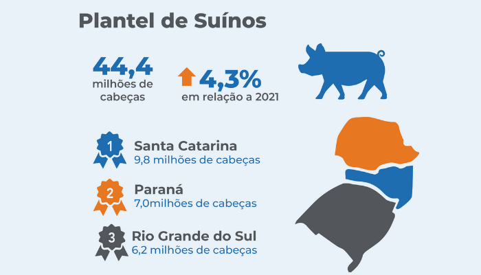 Las tres principales Unidades de la Federación en esta fuerza laboral son las que conforman la Región Sur, por lo tanto, en términos de producción porcina, esta es la principal entre las Grandes Regiones, posición que ocupa desde el inicio de la serie de investigaciones, y que en 2022, fue responsable del 51,9% del número total de animales. Santa Catarina lidera con el 22,1% de la fuerza laboral nacional, lo que equivale a 9,8 millones de cabezas, seguida por Paraná con el 15,8% y Rio Grande do Sul con el 13,9%. No es casualidad que estos sean también los estados, en el mismo orden, que tienen mayor matanza de cerdos en el país.