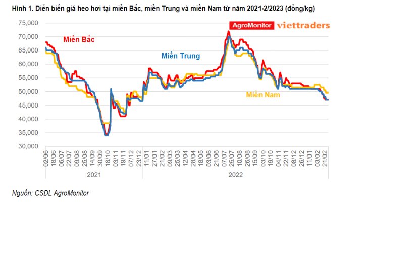 Tại miền Trung và miền Nam cũng ghi nhận biến động giảm trong tháng 2 vừa qua. Tại miền Trung, lực đóng heo biểu to ra Bắc chậm, vào Nam cũng không nhiều cùng tiêu thụ nội vùng ảm đạm khiến tồn kho heo khu vực này có chiều hướng tăng lên. Tại miền Nam, tiêu thụ tại các chợ đầu mối lẫn bán lẻ cũng chậm từ sau Tết, nhiều bếp ăn tập thể vẫn nghỉ cùng lượng thịt đông lạnh được bán ra thị trường khiến các thương lái giảm lượng hàng đóng làm tăng tồn kho tại các công ty/trại dân, trong khi đó, dịch tả heo châu Phi ở nửa đầu tháng vẫn nổ lai rai tại một số tỉnh như Đồng Nai, Bình Dương khiến lượng heo bán chạy dịch ra thị trường nhiều kéo giá heo cũng có xu hướng hạ nhiệt. Theo đó, mức giá phổ biến trong những ngày cuối tháng về quanh 47-50.000 đồng/kg, giảm từ mức 52-54.000 đồng/kg ở ngày đầu tháng.