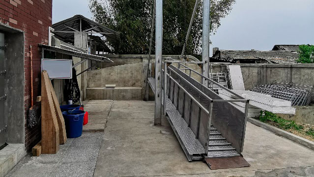 - Chúng ta yêu cầu nhân viên trại và tài xế xe tải thực hiện quy trình an toàn sinh học nào? Không chỉ chủ trại nên truyền đạt các quy trình an toàn sinh học vận chuyển heo cho nhân viên trại và tài xế xe tải trước khi vận hành, mà họ cũng cần trang bị cầu lùa thiết kế chuẩn để tạo điều kiện thuận lợi cho việc tuân thủ các quy trình này. Các chỉ dẫn hữu hình về khu sạch và khu dơ, chẳng hạn như đường kẻ đỏ trên sàn nhà hoặc các chấn song cho phép heo đi qua nhưng cản con người lại luôn hữu ích để nhắc nhở nhân viên và tài xế xe tải rằng vấy nhiễm chéo khiến trại có nguy cơ bị lây nhiễm cao (Ảnh 5 và 6). Ở một số vùng, tích hợp một khu vực được thiết kế kĩ lưỡng cho tài xế đi vào thùng xe là một biện pháp rất tốt để ngăn lây nhiễm khu vực nhận heo. Làm thế nào để giữ cầu lùa được sạch sẽ và sát trùng hiệu quả trong các điều kiện khí hậu khác nhau? Tốt nhất, cầu lùa nên được khép kín, cách nhiệt và có hệ thống sưởi ấm khi cần thiết. Những khía cạnh thiết kế này trở nên đặc biệt quan trọng ở những vùng khí hậu lạnh, nơi hiệu quả sát trùng không cao và vi sinh vật khó tồn tại trong những tháng mùa đông (Ảnh 7). Ngoài ra, chúng phải được làm bằng vật liệu cho phép vệ sinh và sát trùng hiệu quả (bao gồm cả việc làm khô!!!) sau mỗi lần sử dụng. Hệ thống thoát nước của cầu lùa phải đảm bảo rằng nước rửa không chảy vào trại.