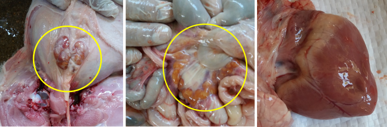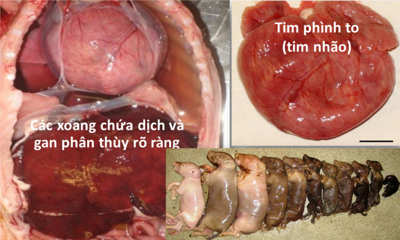 Sưng và tổn thương hạch bẹn (hình trái), hạch lympho màng treo ruột (hình giữa), viêm cơ tim hay tim nhão (hình phải)