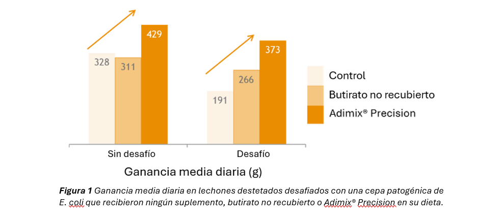 Para comprobar el concepto de liberación precisa de butirato, Adisseo realizó un experimento en la Universidad de Bolonia. Los resultados mostraron que el butirato no recubierto y el butirato recubierto de liberación precisa (Adimix® Precision) redujeron a la mitad la mortalidad en lechones destetados desafiados con E. coli, como se muestra en la Figura 1. Sin embargo, el recubrimiento de alta calidad de Adimix® Precision fue necesario para maximizar el efecto en la ganancia media diaria y en la morfología de las vellosidades intestinales, lo que probablemente mejora la digestión y absorción, reduciendo el riesgo de diarrea.