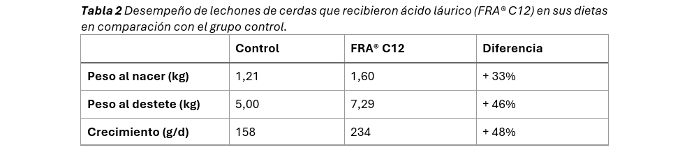 En un reciente experimento de campo realizado en una granja comercial en España, las cerdas recibieron glicéridos de ácido láurico (FRA® C12) en sus dietas una semana antes del parto y durante la lactancia. Se recolectaron, en el día del nacimiento, muestras de lechones de cerdas del grupo control y del grupo de tratamiento. Los resultados mostraron que los glicéridos de láurico redujeron significativamente el recuento de células de S. suis en las heces y en los hisopos bucales de los lechones recién nacidos en un 35% y un 11%, respectivamente. Además, E. coli en las heces de los lechones se redujo en un 47%, destacando el efecto positivo del ácido láurico en el microbioma tanto de las cerdas como de sus crías. La menor presión de infección por S. suis combinada con un microbioma más equilibrado permitió un crecimiento más rápido de los lechones durante la lactancia, resultando en un peso al destete significativamente mayor, como se muestra en la tabla a continuación.