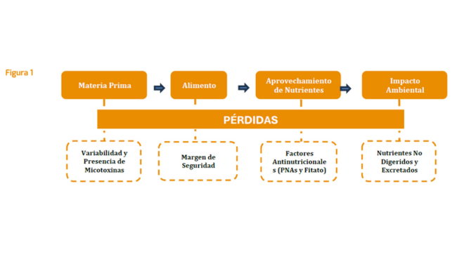 Los animales de alto rendimiento actualmente requieren prácticas de nutrición que sean eficientes y económicamente viables. Sin embargo, este proceso implica desafíos significativos, como la variabilidad en el perfil nutricional y la calidad de los ingredientes, así como la presencia de factores antinutricionales. Además, la presencia de micotoxinas puede afectar negativamente tanto la eficiencia productiva como la salud animal (Figura 1).