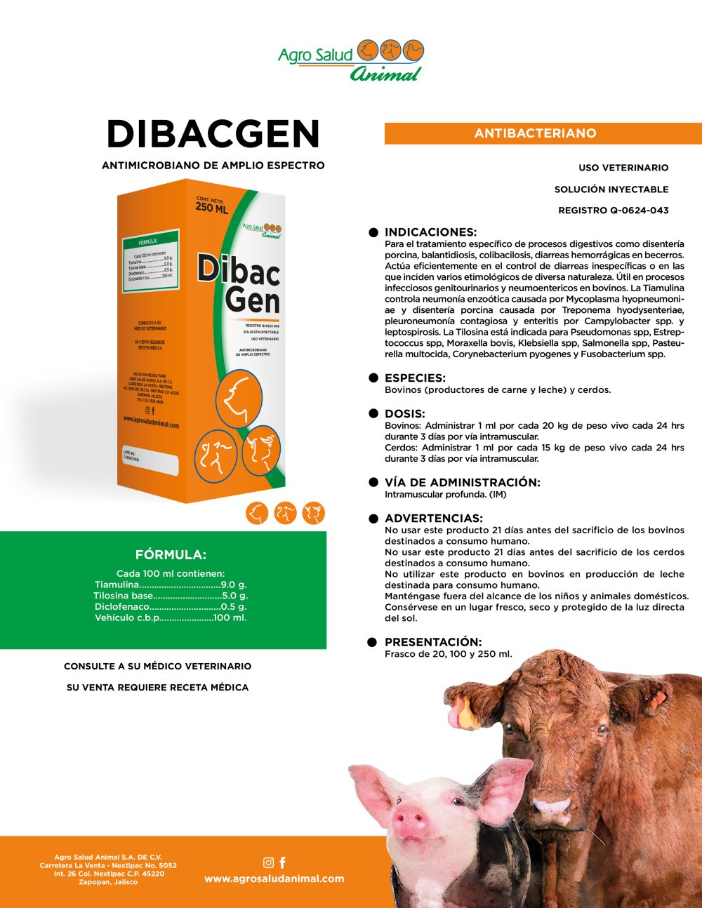 Indicaciones: Para el tratamiento específico de procesos digestivos como disentería porcina, balantidiosis, colibacilosis, diarreas hemorrágicas en becerros. Actúa eficientemente en el control de diarreas inespecíficas o en las que inciden varios etimológicos de diversa naturaleza. Útil en procesos infecciosos genitourinarios y neumoentericos en bovinos. La Tiamulina controla neumonía enzoótica causada por Mycoplasma hyopneumoniae y disentería porcina causada por Treponema hyodysenteriae, pleuroneumonía contagiosa y enteritis por Campylobacter spp. y leptospirosis. La Tilosina está indicada para Pseudomonas spp, Estreptococcus spp, Moraxella bovis, Klebsiella spp, Salmonella spp, Pasteurella multocida, Corynebacterium pyogenes y Fusobacterium spp.