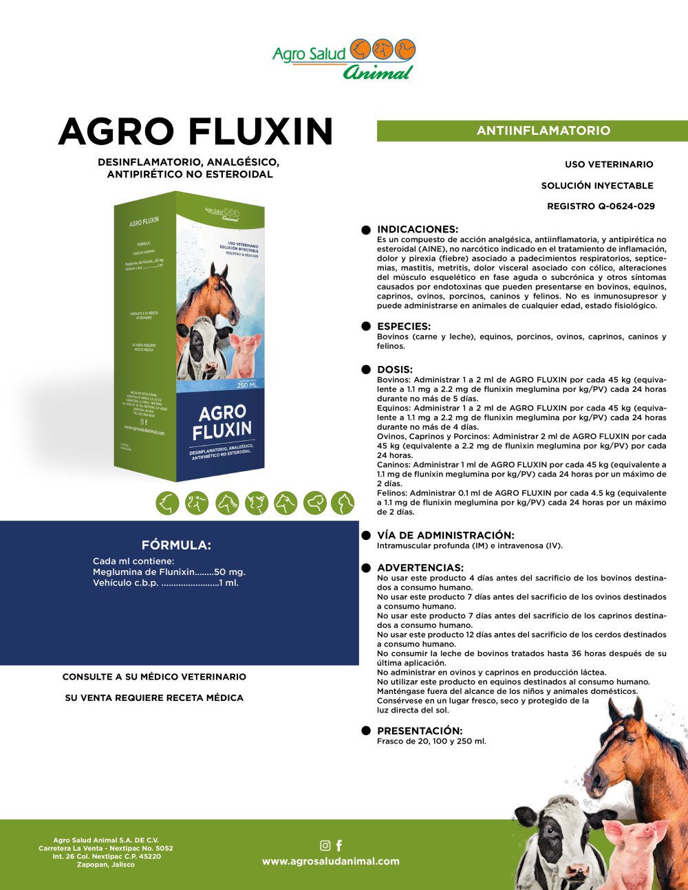 Ovinos, caprinos y porcinos: Administrar 2ml de Agro Fluxin por cada 45kg (equivalente de 2.2mg a 2.2mg de flunixin meglumina por kg/pv) cada 24 horas.