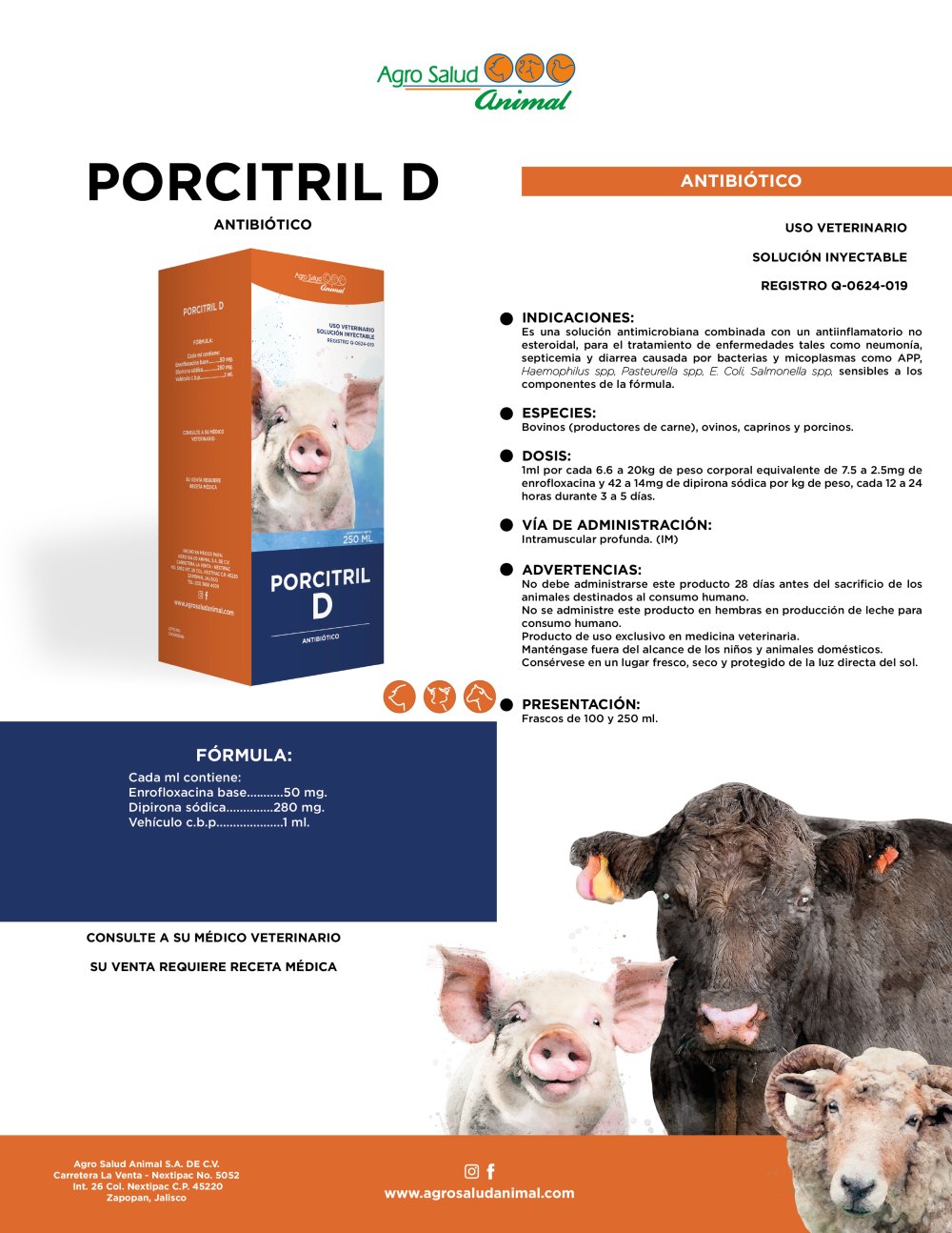 Indicaciones: Es una solución antimicrobiana combinada con un antiinflamatorio no esteroidal, para el tratamiento de enfermedades tales como neumonía, septicemia y diarrea causada por bacterias y micoplasmas como APP, Haemophilus spp, Pasteurella spp, E. Coli, Salmonella spp, sensibles a los componentes de la fórmula.