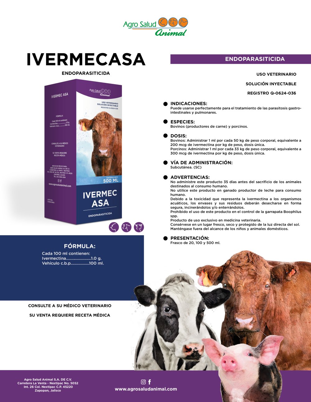 Porcinos: Administrar 1 ml por cada 33 kg de peso corporal, equivalente a 300 mcg de ivermectina por kg de peso.