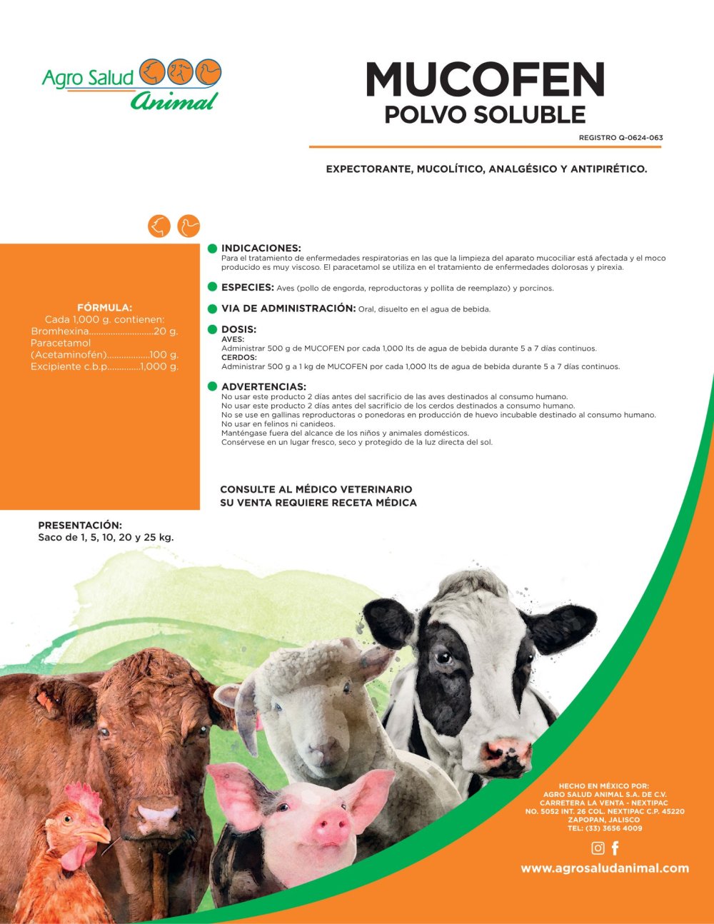AVES: Administrar 500 g de MUCOFÉN por cada 1,000 lts de agua de bebida durante 5 a 7 días continuos.