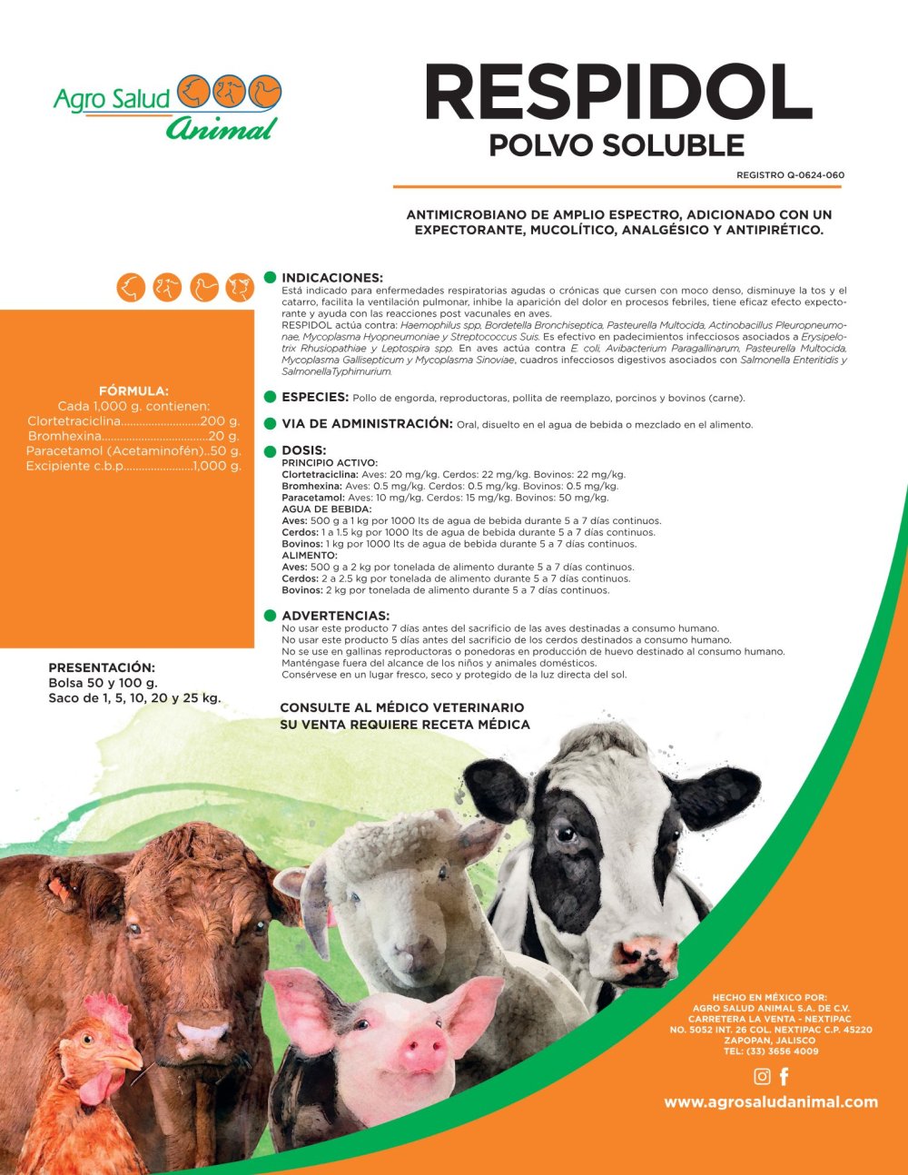 RESPIDOL actúa contra: Haemophilus spp, Bordetella Bronchiseptica, Pasteurella Multocida, Actinobacillus Pleuropneumoniae, Mycoplasma Hyopneumoniae y Streptococcus Suis. Es efectivo en padecimientos infecciosos asociados a Erysipelotrix Rhusiopathiae y Leptospira spp. En aves actúa contra E. coli, Avibacterium Paragallinarum, Pasteurella Multocida, Mycoplasma Gallisepticum y Mycoplasma Sinoviae, cuadros infecciosos digestivos asociados con Salmonella Enteritidis y SalmonellaTyphimurium.