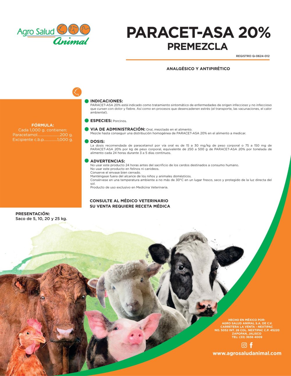 La dosis recomendada de paracetamol por vía oral es de 15 a 30 mg/kg de peso corporal o 75 a 150 mg de PARACET-ASA 20% por kg de peso corporal, equivalente de 250 a 500 g de PARACET-ASA 20% por tonelada de alimento cada 24 horas durante 3 a 5 días continuos.