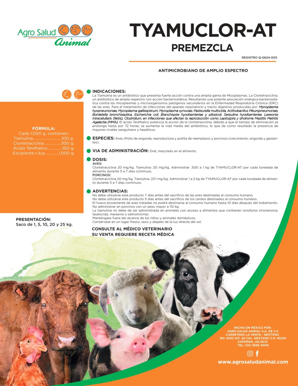 PORCINOS: Clortetraciclina 20 mg/kg. Tiamulina: 23.1 mg/kg. Administrar 1 a 2 kg de TYAMUCLOR-AT por cada tonelada de alimento durante 5 a 7 días continuos.