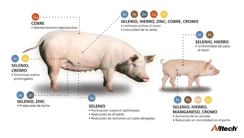 Alltech ha demostrado que se puede conseguir una gestión nutricional moderna mediante la suplementación de oligoelementos quelados en forma de minerales, Bioplex®, (que incluyen zinc, cobre, hierro y manganeso), y selenio orgánico, Sel-Plex®, que han demostrado científica y comercialmente que optimizan la nutrición de las cerdas.