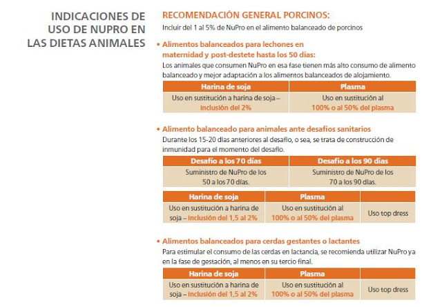 Uso en dietas de lechones en sustitución a la harina de soja. En este caso, puede sustituirse en el mismo porcentaje, no es necesario reformular. Uso en sustitución al plasma como forma de reducir el costo del pienso manteniendo el rendimiento. Para sustituir el plasma, es necesario reformular el alimento balanceado.