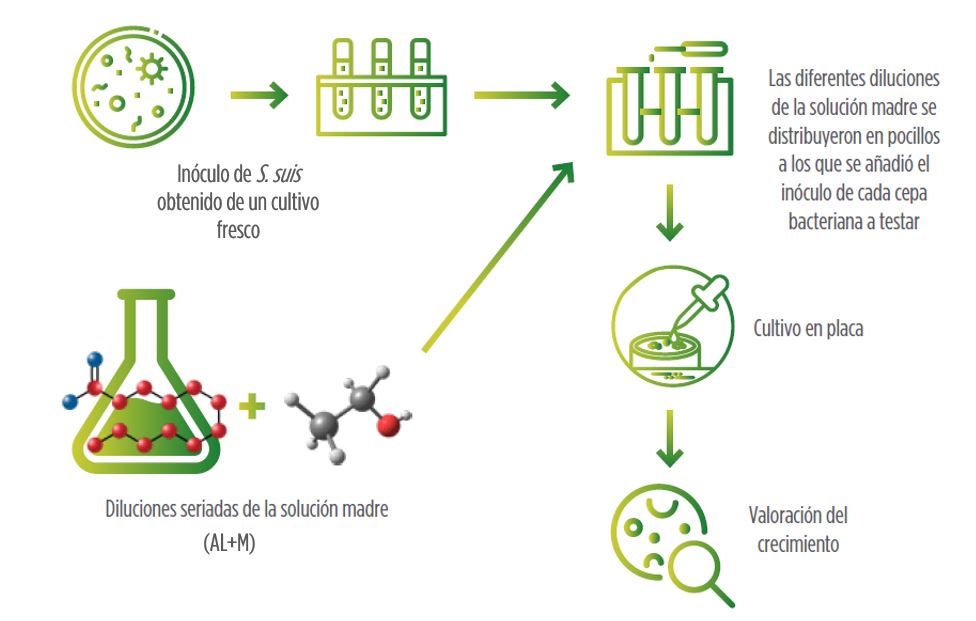 Las diferentes diluciones de la combinación AL+M fueron mezcladas con el inóculo de S. suis obtenido a partir del cultivo fresco de cada cepa y luego inoculadas en placas con agar sangre, incubadas y revisadas a las 48h para detectar crecimiento bacteriano.