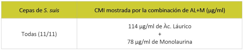 La combinación de Ácido láurico y Monolaurina puede inhibir el crecimiento de cepas patógenas de Streptococcus suis cuando la concentración es adecuada.