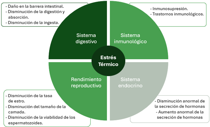 Fig. 1. Efectos del estrés térmico sobre el sistema digestivo, el rendimiento reproductivo, el sistema inmunológico y el sistema endocrino.