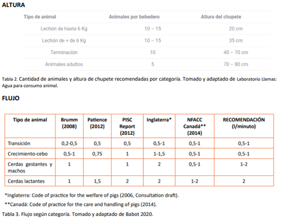 La recomendación general es tener un bebedero único por cada 10 a 15 cerdos, generalmente en una proporción de 1:12 de bebedero por cerdo. Otras recomendaciones pueden verse en la tabla 2.