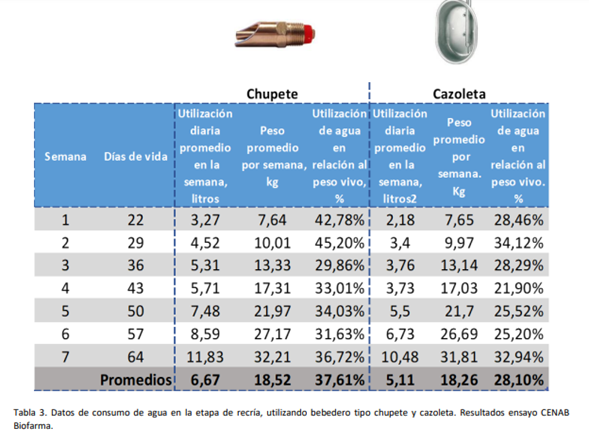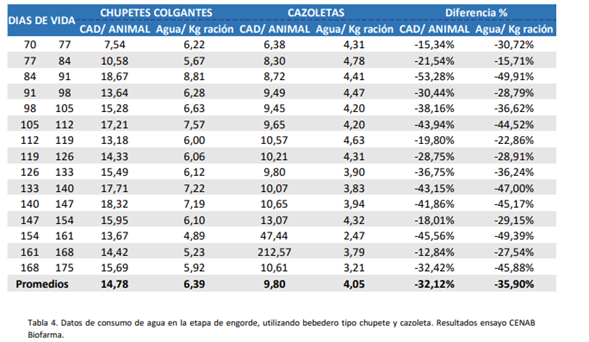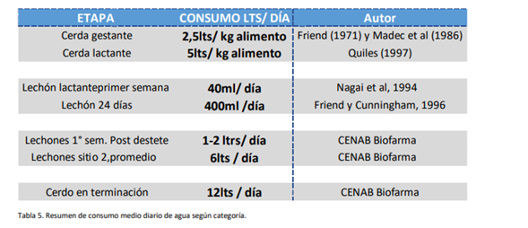 Lechones lactantes: a partir de las 4-5 horas posteriores al nacimiento, el lechón comienza a consumir agua, siendo el consumo alrededor de 36 ml. al día de nacido y llegando a 403 ml. al día 28 de vida.