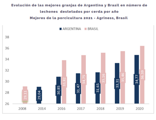 En los últimos años producción porcina ha avanzado y se ha intensificado notablemente, logrando producir más cantidad de lechones nacidos vivos, más lechones destetados y más kilos por hembra por año, y gracias al constante desarrollo en materia de nutrición, manejo, sanidad y genética estos números siguen mejorando. Esto nos arroja que, en Brasil, por ejemplo, las hembras muestran un aumento promedio de 4,09 lechones destetados por hembra por año en los últimos 6 años, mientras que en Argentina este número se encuentra en 2,98 lechones más en el año 2020 respecto al 2014. (AGRINESS 2021).