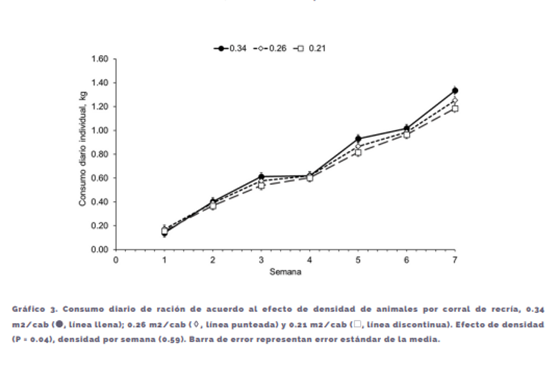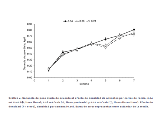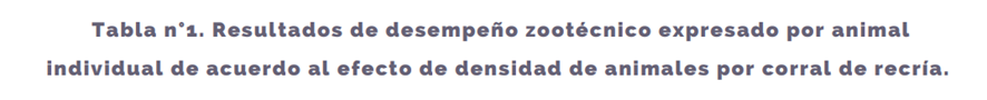 Para la variable "Ganancia de Peso Total" (Kg/ Cabeza) fueron encontradas diferencias significativas para el T1 respecto de T2 y T3. Esto nos arroja una diferencia de 1,5 y 1,76kg de ganancia totales, en relación a T2 y T3, respectivamente. El consumo de ración diaria manifestó que hubo un mayor consumo, significativo estadísticamente, entre T1 y T3. En términos porcentuales, los animales del T1 tuvieron un 7,9% más de consumo de ración diaria durante el período de prueba. No hubo diferencias para este parámetro entre T2, respecto a T1 y T3. La variable "Aumento diario de Peso", manifestó una diferencia significativa estadísticamente, para el T1 respecto a T2 y T3. En términos absolutos, los animales del T1 aumentaron diariamente 30 y 36 gramos más, en relación a T2 y T3, respectivamente. En términos porcentuales, T1 manifestó una GPD un 6% mayor respecto a T2, y un 7,1% mayor respecto a T3. No hubo diferencias estadísticamente significativas para la variable "Conversión Alimenticia". Para la variable de "Lesiones Cutáneas", se expresó diferencia significativa para T1 respecto a T2 y T3. No hubo diferencias entre T2 y T3. En términos porcentuales, se encontraron un 40% menos de lesiones para el T1 respecto a T2; y un 42% menos de lesiones respecto a T3. Si bien no fueron significativas, hubo un 4% menos de lesiones en T2 respecto a T3, lo que nos indica una tendencia hacia mayor presencia de lesiones, a mayor densidad animal.