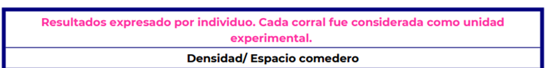 - Tratamiento 3: Densidad Animal Alta. Corral cargado con 16 animales. Densidad de 0,214m2/ animal; 2,13 cm lineales de comedero/ animal y 1 bebedero tipo cazoleta cada 16 animales. Con una relación de 5,33 animales por boca.
