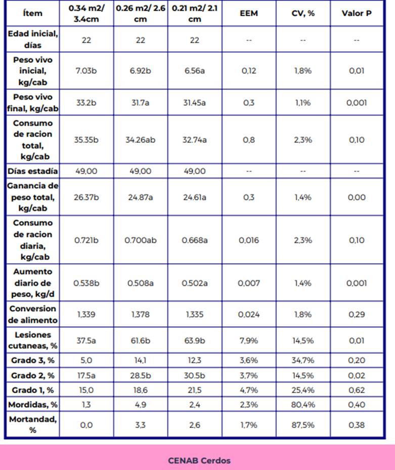Los animales fueron pesados al ingreso con 22 días y luego semanalmente a los 29, 36, 43, 50, 57, 64 y 71 días de edad para determinar la ganancia de peso diaria (GPD) en cada fase; el consumo de ración diaria (CRD) y el cálculo de la conversión alimenticia (CA); se registró la ración ofrecida y las sobras al final de cada semana. Además se realizó un relevamiento diario de la cantidad de lesiones asociadas a peleas, caudofagia y mordeduras de orejas, para determinar de forma porcentual su nivel de aparición.