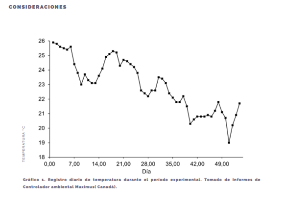 Las condiciones ambientales fueron monitoreadas de manera constante gracias al uso de controladores Maximus (Canadá), que permitió obtener temperaturas ambiente de 26, 24, 23, 22, 21, y 18 grados centígrados para las semanas de estadía. Fueron utilizadas cuatro fases de alimento según el programa propuesto por Biofarma S.A en su Línea Perfecto: Perfecto Nursery; Perfecto Transición, Perfecto Inicial micropeleteado y Perfecto Recría micropeleteado. Agua y alimento fueron ofrecidos a voluntad durante todo el período experimental.