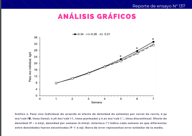 Los resultados de desempeño zootécnico están representados en la tabla n°1. En la misma se observó una diferencia estadística en el peso inicial de los animales al ingreso del ensayo, por lo que esta medida fue utilizada como covarianza e incluida en todos los análisis estadísticos. Respecto a la variable "Peso Vivo Final" (Kg/ Cabeza) se encontraron diferencias significativas para el Tratamiento 1 de Baja Densidad Animal, respecto de los Tratamientos 2 y 3, de Media y Alta Densidad Animal (P valor 0,001). En este punto se observó que los animales del T1 finalizaron la prueba con una ganancia neta de 1,5kg y 1,750kg superior a los T2 y T3, respectivamente. Esto significó animales un 4,7% y 5,5% más pesados respecto a los T2 y T3, respectivamente. Los resultados de desempeño zootécnico están representados en la tabla 1. Para la variable "Peso Vivo Final" (Kg/ Cabeza) fueron encontradas diferencias significativas para el Tratamiento 1 de Baja Carga Animal, respecto de los Tratamientos 2 y 3, de Media y Alta Carga Animal (P valor 0,001). En este punto se observó que los animales del T1 finalizaron la prueba con una ganancia neta de 1,5kg y 1,750kg superior a los T2 y T3, respectivamente. Esto significó animales un 4,7% y 5,5% más pesados respecto a los T2 y T3, respectivamente. Los pesos individuales por semana se mantuvieron similares hasta la semana 4. A partir de este punto, comenzó a expresarse una diferencia significativa para los animales del T1 lo que nos indicaría que con más espacio los animales expresan mejor su potencial individual.