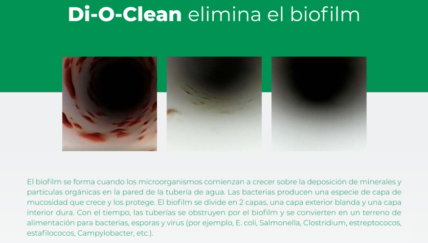 - Elimina las capas de biofilm existentes en las tuberías de agua