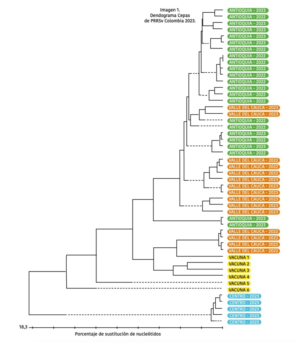 A través de los resultados recientes de la caracterización de PRRSv en Colombia, se ha corroborado que las cepas identificadas son genotipo americano (tipo 2). Adicionalmente, logramos verificar que existe más de un linaje circulando en nuestra industria, lo cual resalta la importancia de que dos granjas PRRS positivas pueden tener un virus diferente y por eso sus animales no deben ser mezclados. También logramos entender que conforme fue aumentando el número de muestras analizadas, la divergencia entre las cepas de las diferentes granjas y regiones fue aumentando como se esperaba. Esta información sugiere: