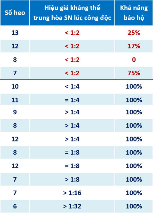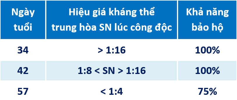 Nghiên cứu cũng tiến hành trên heo con theo mẹ có hàm lượng kháng thể mẹ truyền khác nhau ở các nhóm tuổi khác nhau. Kết quả cho thấy, mức hiệu giá kháng thể trung hoà từ 1:8 (giá trị tương đương 3log2) là đủ bảo hộ heo con sau khi công độc.