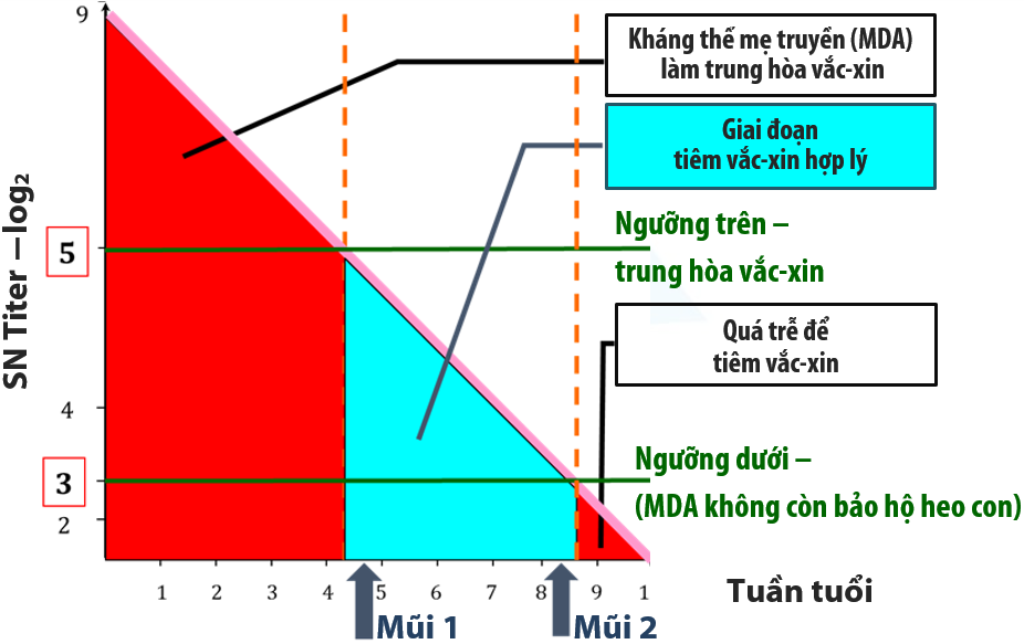 Vì vậy, nên chọn thời điểm tiêm phòng cho heo con khi kháng thể mẹ truyền nhỏ hơn 5log2 (không làm trung hoà vắc-xin) và ≥ 3log2 (vẫn còn bảo hộ).