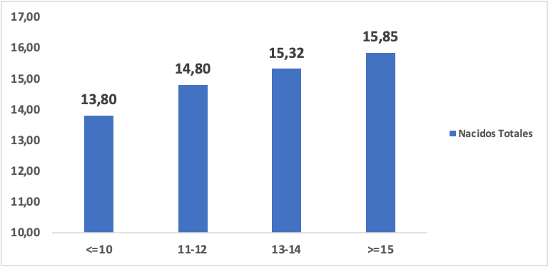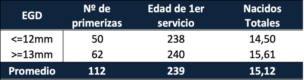 Como se puede observar en la Tabla 1., las primerizas que fueron servidas con EGD mayor o igual a 13 mm tuvieron un promedio de nacidos totales 1,11 mayor que las primerizas servidas con EGD igual o menor a 12mm.