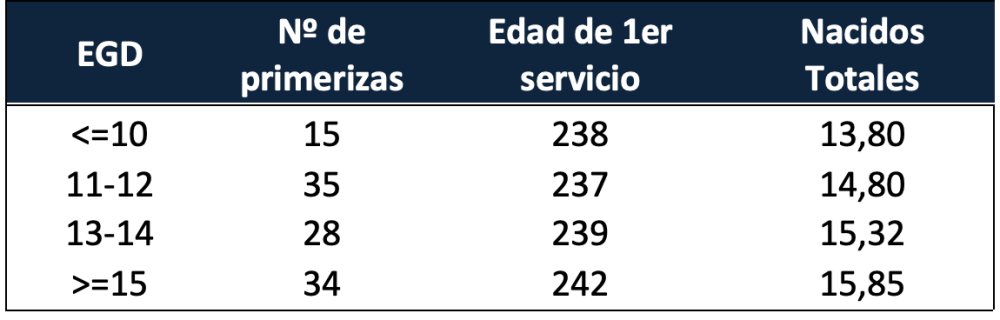 Tabla 2. Prolificidad de primerizas servidas en diferentes rangos de EGD.
