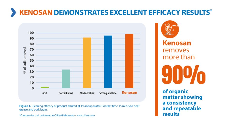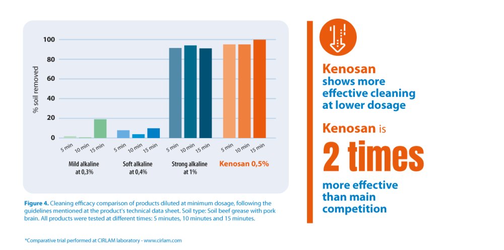 In the comparative trial performed by CIRLAM laboratory. It is demonstrated that an optimally performed cleaning procedure should achieved more than 90% of soil removal, and in this case, Kenosan compared to their main competition, showed the highest cleaning removal on a very sticky and grease soil (soil beef grease and pork brain) when diluted at 1% with a contact time of 15 minutes action.