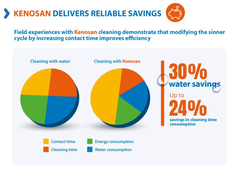 Kenosan supposes a modest investment in an effective detergent formulation resulting in a 40% enhancement in cleaning efficacy relative to simple water-based cleaning, while concurrently reducing water consumption by up to 30% and labor time by up to 24% in industries like pig and poultry farming.