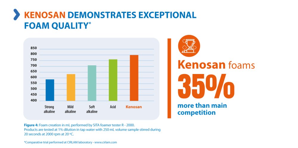 At the comparative trial performed at CIRLAM laboratory, Kenosan showed a foam capacity 35% more effective than that of leading competitors. A well-chosen detergent, therefore, represents a substantial return on investment in terms of resource efficiency and cost-effectiveness.