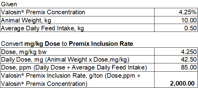 Table 1. Sample Dose Calculation of Valosin® Premix