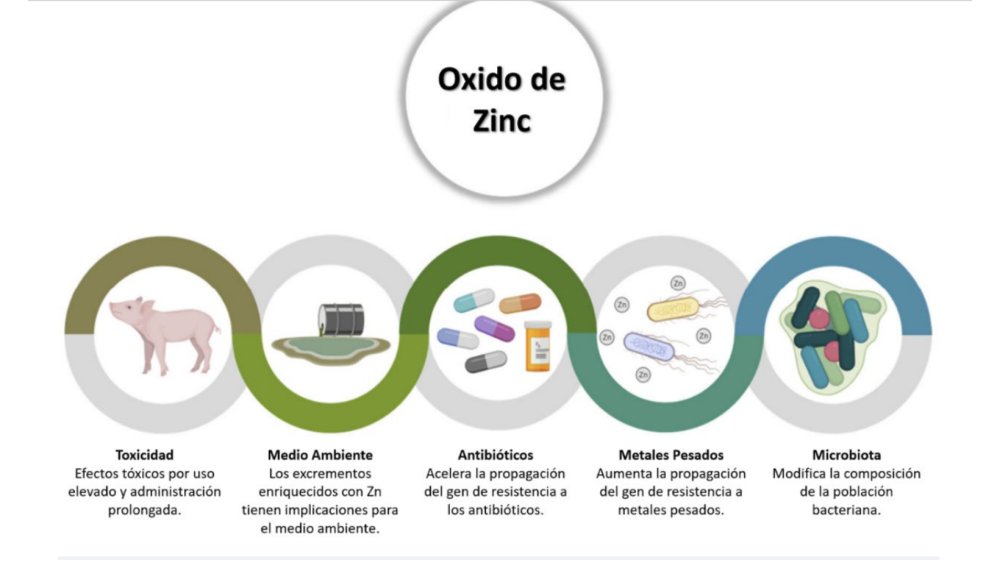 Sin embargo, el uso de ZnO en altas dosis presenta problemas que deben ser considerados al momento de formular el programa nutricional. El uso elevado y prolongado de ZnO a niveles farmacológicos en cerdos generó varias preocupaciones, como se ilustra en la Figura 2, como: