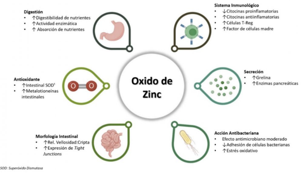 En general, el principal mecanismo de acción del ZnO parece estar relacionado con un aumento sustancial de la absorción de nutrientes y de la morfología intestinal de los lechones, mejorando el rendimiento, asegurando una mayor proporción de la relación vellosidades:criptas y un considerable efecto proliferativo sobre los enterocitos.