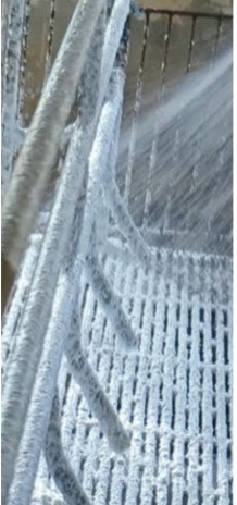 Espuma: La aplicación en espuma permite un importante ahorro de agua mediante la incorporación de aire a la mezcla, esto puede reducir el consumo de agua hasta en un 50%. Para lograr una limpieza eficiente es necesario identificar claramente las zonas de suciedad y dejar actuar, una buena aplicación evita el repetir el procedimiento y dejar actuar un mayor tiempo la espuma con la superficie, se optimiza la remoción de materia orgánica. La aplicación en espuma requiere la utilización de equipo específico para aplicaciones de formulación espumante o en gel.